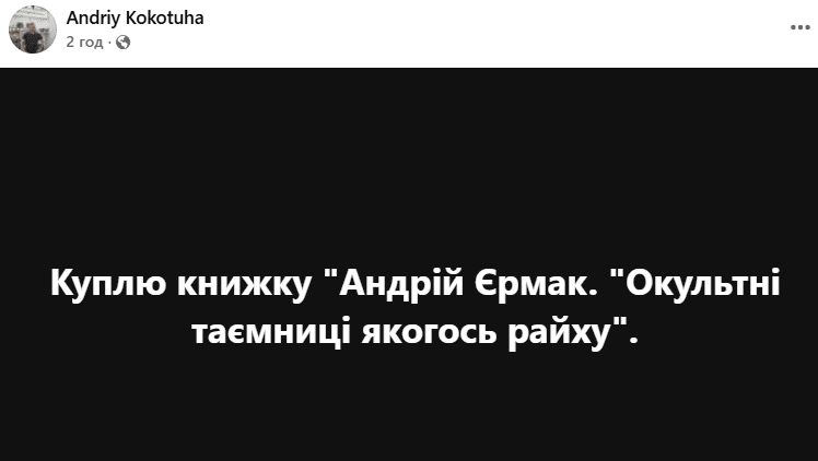 Відомий український письменник Андрій Кокотюха питає, чи є книга Єрмака, де той ділиться отриманим досвідом, і навіть придумав ексглаві ОП нове прізвище — Єрмаг.