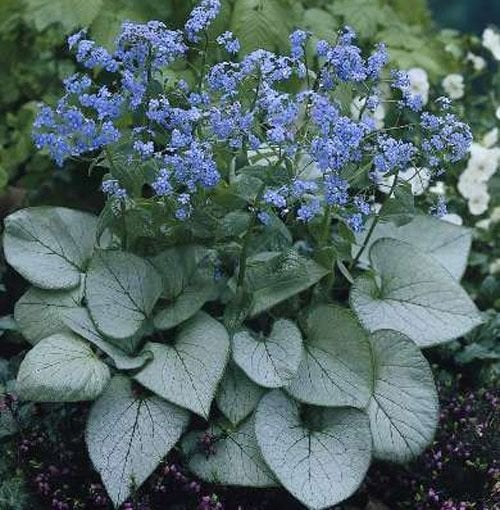 Бруннера — «незабудка для тіні» вкривається дрібними небесними квітами навесні, а велике сріблясте листя прикрашає сад до самих холодів.