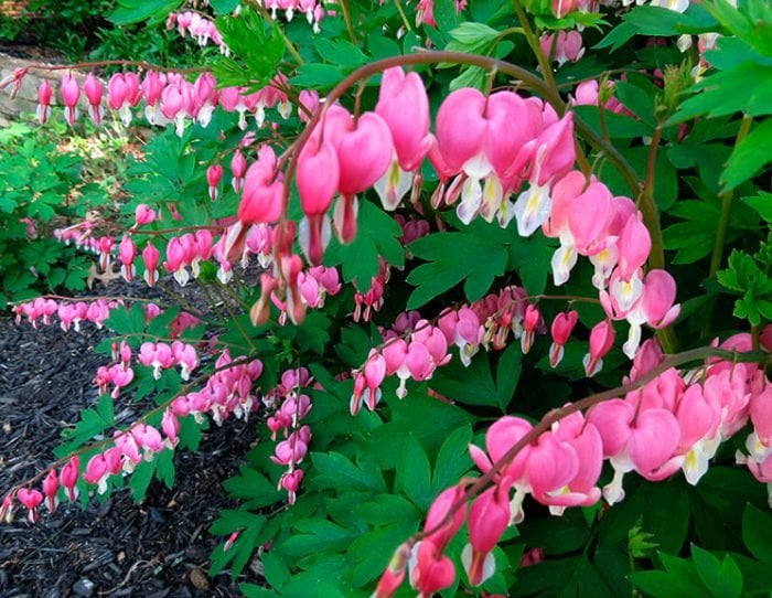 Дицентра (розбите серце) має унікальні квіти у формі сердечок. У вологих тінистих місцях її ніжне різьблене листя зберігає свіжість набагато довше, ніж на сонці.
