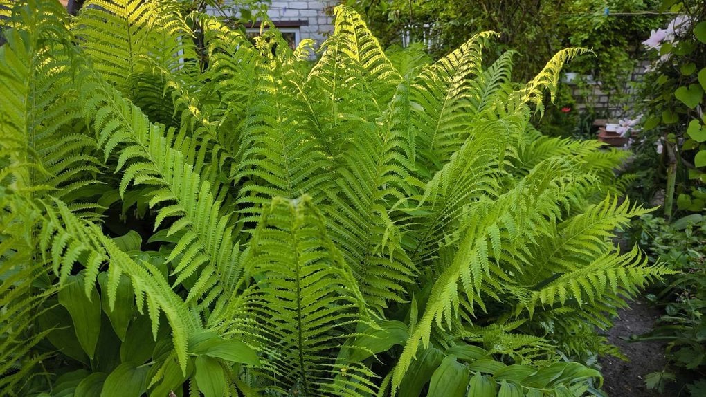 Папороть (страусник або щитник) — класика тінистого саду. Її ажурні вайї створюють неповторний об’єм та атмосферу дикого лісу там, де панує постійна тінь.