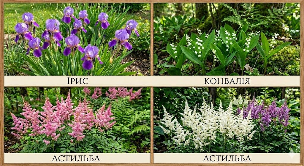 Для глинистих ділянок, де затримується волога, найкраще підійдуть іриси, конвалії та астильби.