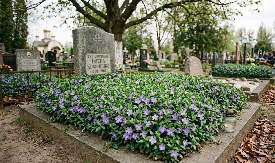 Для тих, хто не може часто відвідувати кладовище, ідеальним варіантом стануть ґрунтопокривні культури. Вони щільно вкривають землю, не даючи рости бур’янам. До цієї групи належать барвінок, седум (очиток), вербозілля та декоративна суниця.