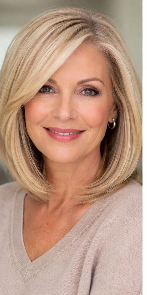 Подовжений боб залишається однією з найвдаліших стрижок для зрілих жінок. Його ключова особливість — м’яке обрамлення обличчя шаруватими пасмами, які створюють ефект підняття в зоні вилиць і щелепи. Завдяки легкому градуюванню волосся отримує об’єм біля коренів, а рухливість пасом робить образ динамічним і сучасним.