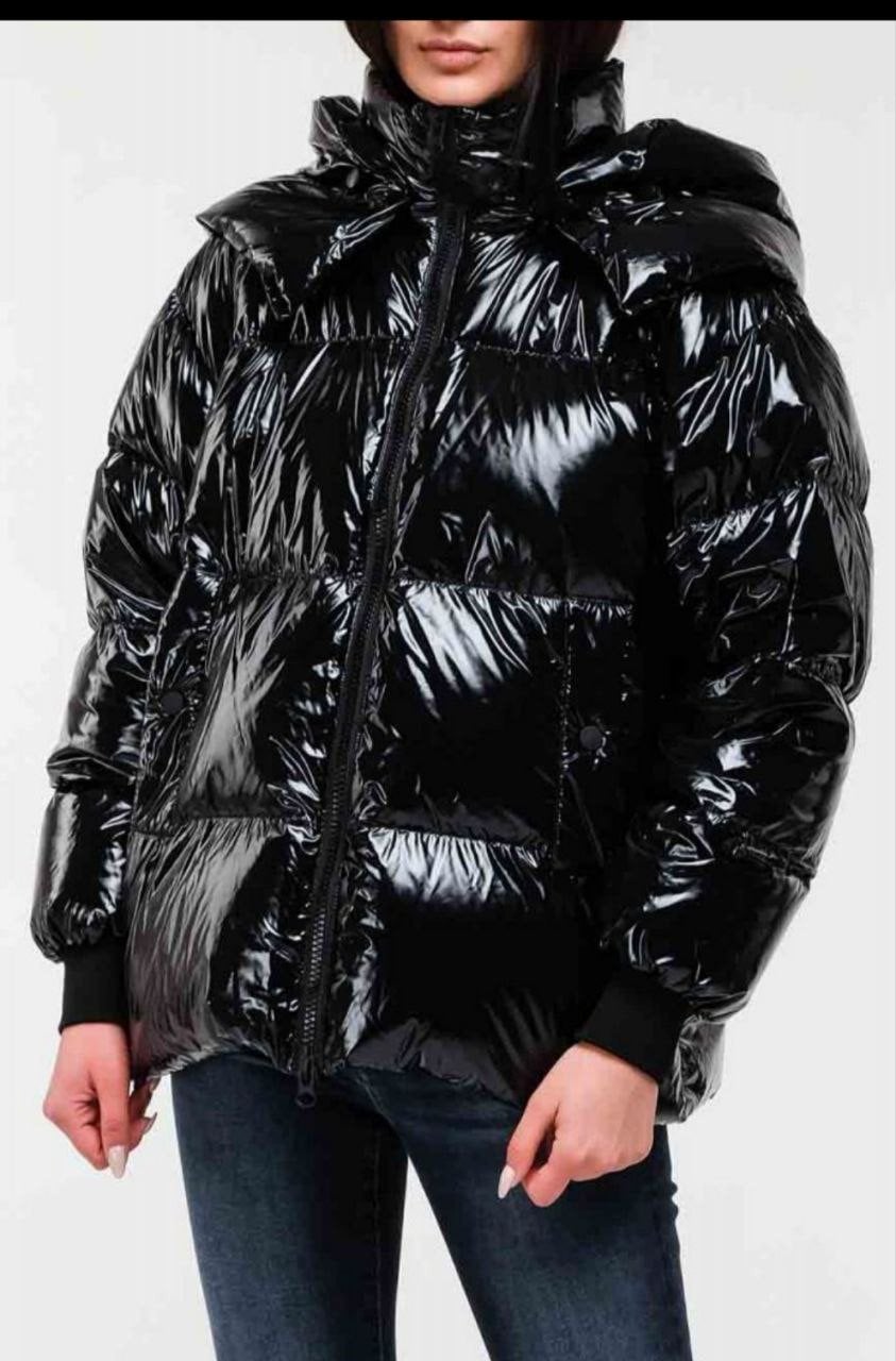 Антитренд: блискучий короткий пуховик з великими горизонтальними прошивками