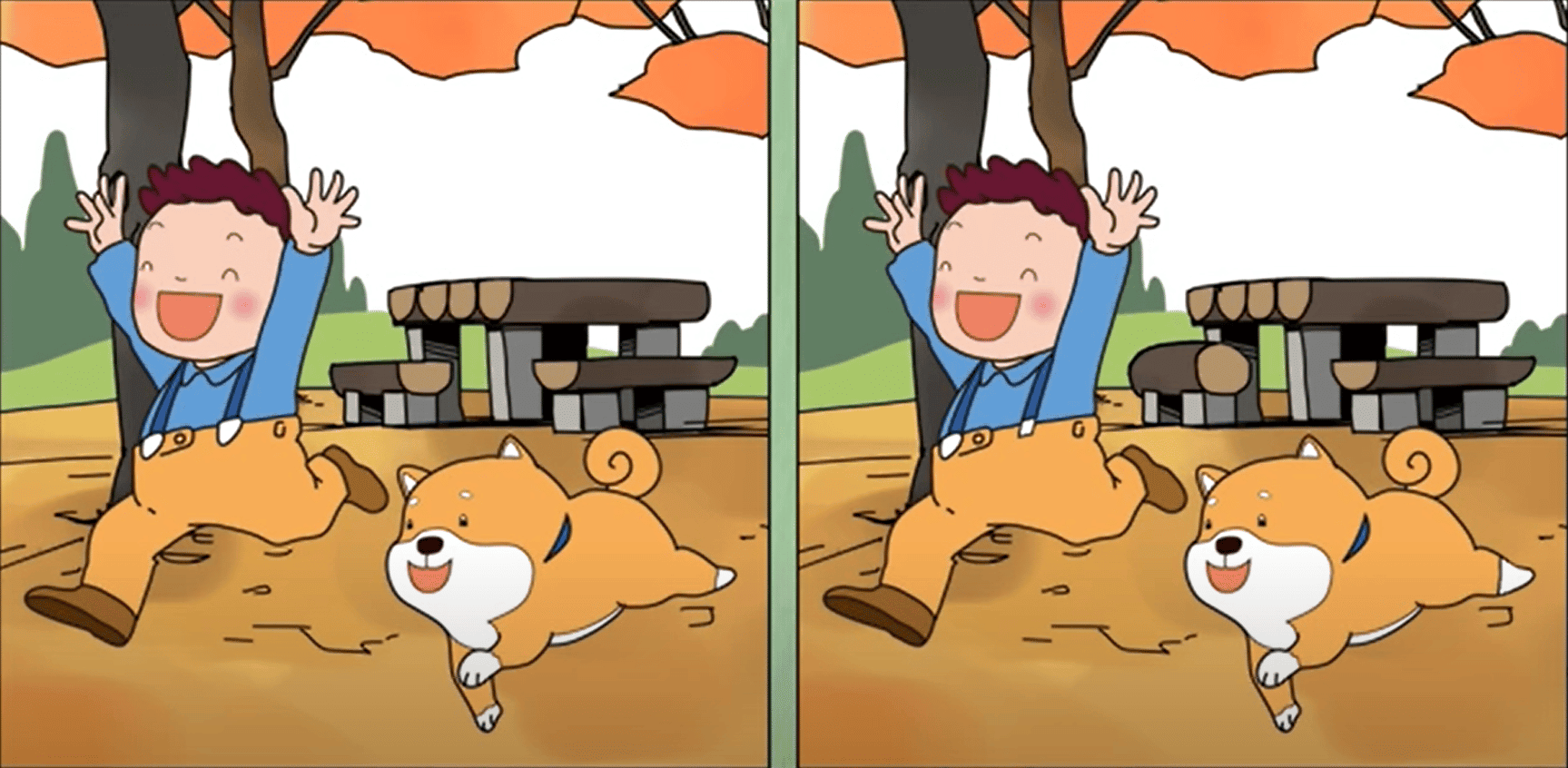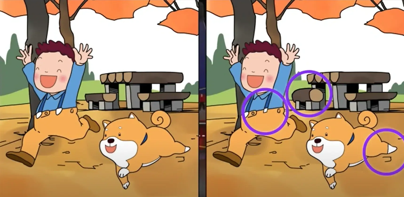 На зображенні нижче ви побачите дві картинки хлопчика, який грає з собакою у парку. Уважно розгляньте їх, приділяючи увагу кожній деталі, і знайдіть приховані відмінності. Усього потрібно знайти 3 помилки. На це у вас є 10 секунд!