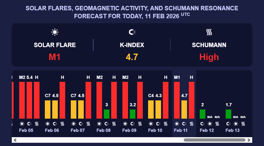 Сьогодні, 11 лютого, активність Сонця перебуває на середньому рівневі. Магнітна буря матиме К-індекс 4,7 (жовтий рівень).