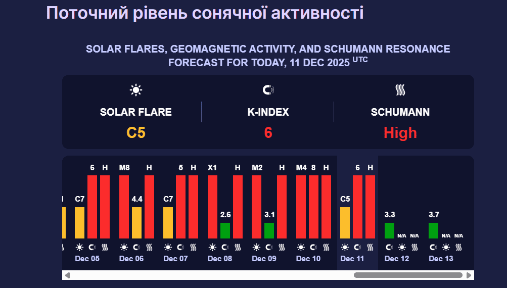 У п’ятницю, 12 грудня, активність Сонця ослабне. Магнітна буря опуститься до зеленого рівня, що відповідатиме К-індексу 3.3.