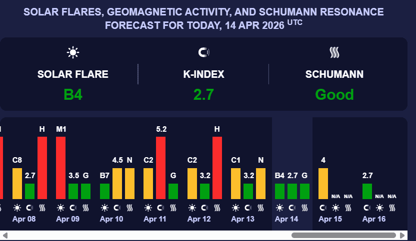 У вівторок, 14 квітня, активність Сонця послабиться. Очікується низька магнітна буря з К-індексом 2.7 (зелений рівень).