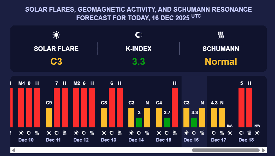 Сьогодні, 17 грудня, очікується магнітна буря середньої потужності. Вона відповідатиме К-індексу 4,3 (жовтий рівень").