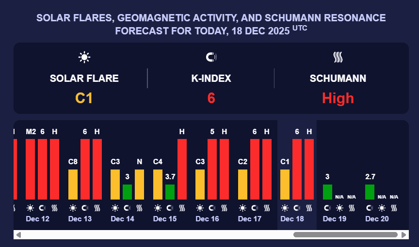У четвер, 18 грудня, вдарила потужна магнітна буря. Вона посилилася до червоного рівня - К-індексу 6.
