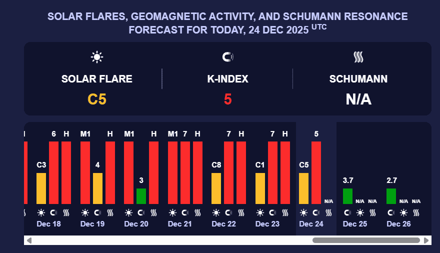 У четвер, 25 грудня, очікується слабка магнітна буря. Активність Сонця відповідатиме К-індексу 3.7 (зелений).