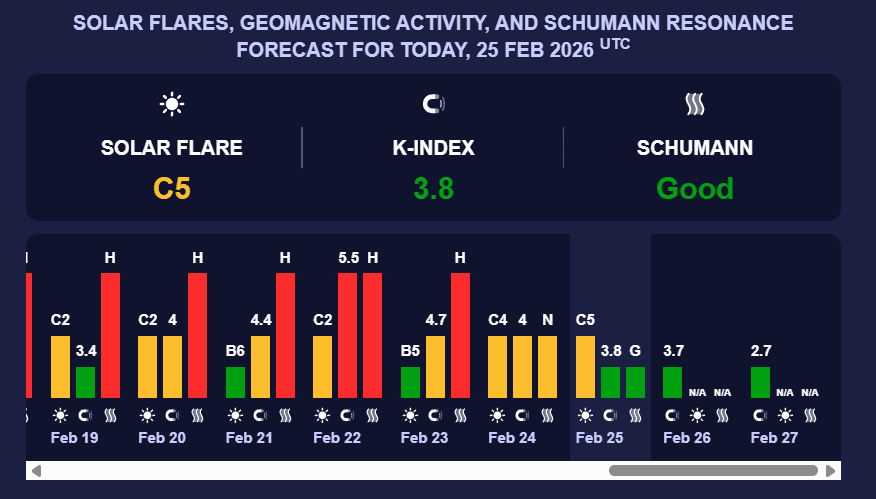 У четвер, 26 лютого, очікуються слабкі геомагнітні умови. Магнітна буря відповідатиме К-індексу 3,7 (зелений рівень).