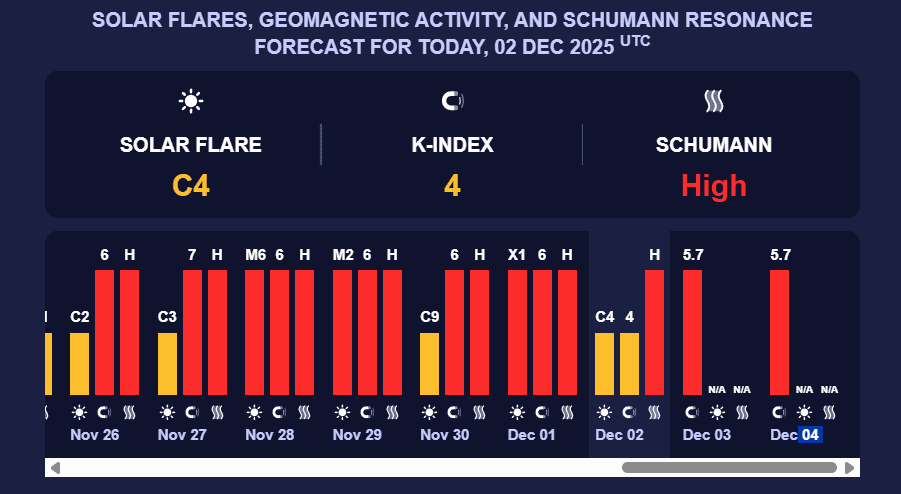Сонячний спалах класу X 1 грудня спричинив викид корональної маси. Існує дуже невелика ймовірність того, що він пройде повз Землю. Ця подія в поєднанні зі швидким потоком вітру може підвищити рівень активності Сонця до STORM G1.