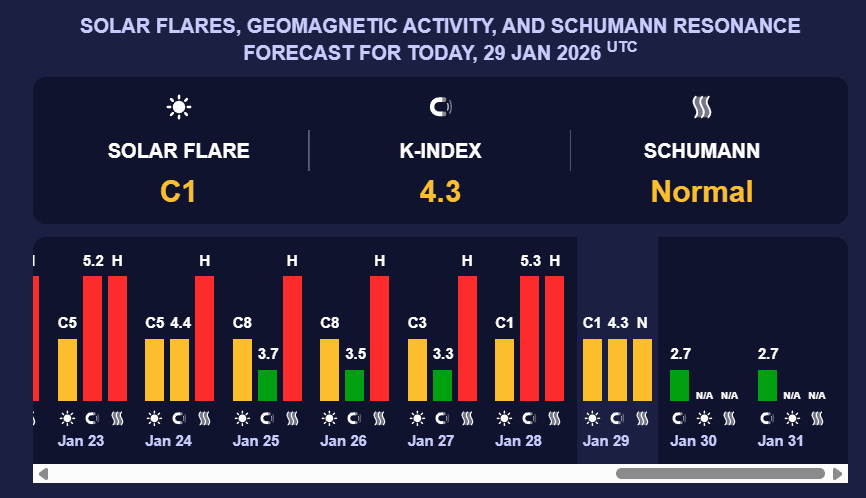 У п’ятницю, 30 січня, активність Сонця послабиться. Очікується слабка магнітна буря зеленого рівня, яка матиме К-індекс 2,7.