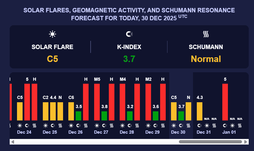 У середу, 31 грудня, активність Сонця трохи підвищилася. Очікується магнітна буря середньої потужності. Вана відповідатиме К-індексу 4,3 (жовтий рівень).