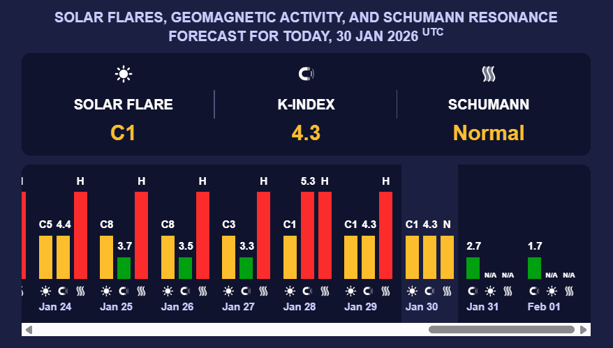 У суботу, 31 січня, магнітна буря буде слабкою. Очікується К-індекс 2,7 (зелений рівень).