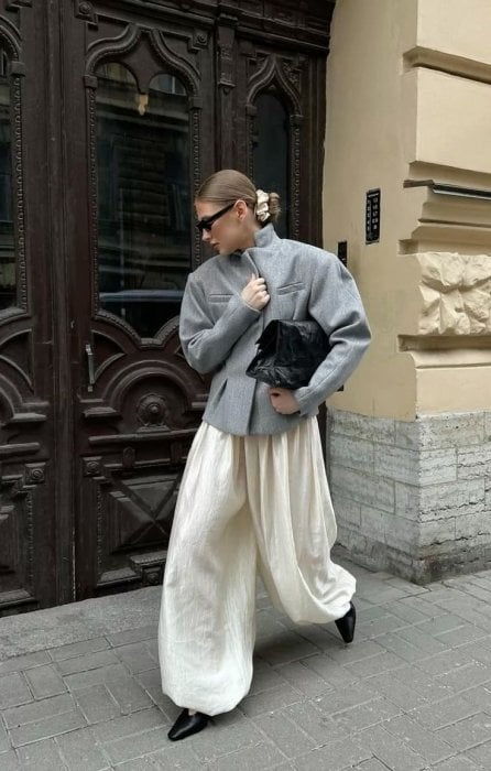 Щодо того, як найкраще стилізувати цю модель сьогодні, варто звернути увагу на цікавий прийом з минулого — використання яскравої хустки, зав’язаної на стегнах. Це додає образу багатошаровості та підкреслює талію, врівноважуючи об’ємний низ. Оскільки штани самі собою дуже акцентні, їх рекомендується поєднувати з лаконічним верхом, наприклад, із приталеним топом або вузьким боді, щоб зберегти гармонію пропорцій та зробити силует витонченим.