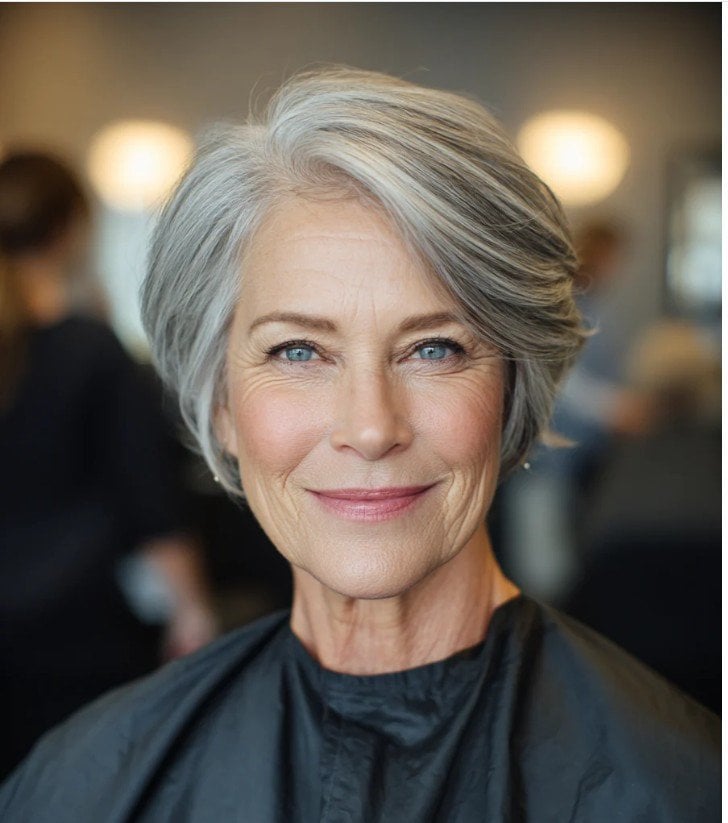 Завдяки округлому силуету та професійному градуюванню пасом зачіска набуває помітної густоти та пишності. А м’який сіро-сивий колір підкреслює витонченість образу, виглядаючи актуально та надзвичайно благородно.