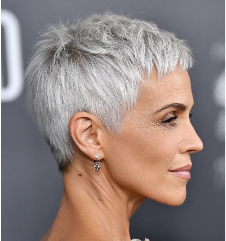 Коротка стрижка з акцентованим верхом та акуратно оформленою потилицею створює елегантний та стриманий силует. Холодна платина ідеально виділяє точність зрізів, додаючи образу особливої чистоти та сучасної свіжості. Така форма виглядає максимально доглянуто і дозволяє акцентувати увагу на рисах обличчя.