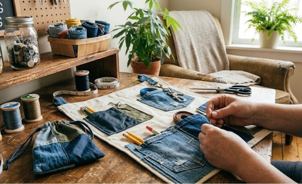 Більш складним, але надзвичайно практичним рішенням стане настінна панель: до цупкої основи пришиваються кишені різних розмірів, перетворюючи клапті на ідеальне сховище для ключів у передпокої, олівців у робочій зоні або інструментів у майстерні. Маленькі ж обрізки легко трансформуються у зручні косметички чи органайзери для швейного приладдя.