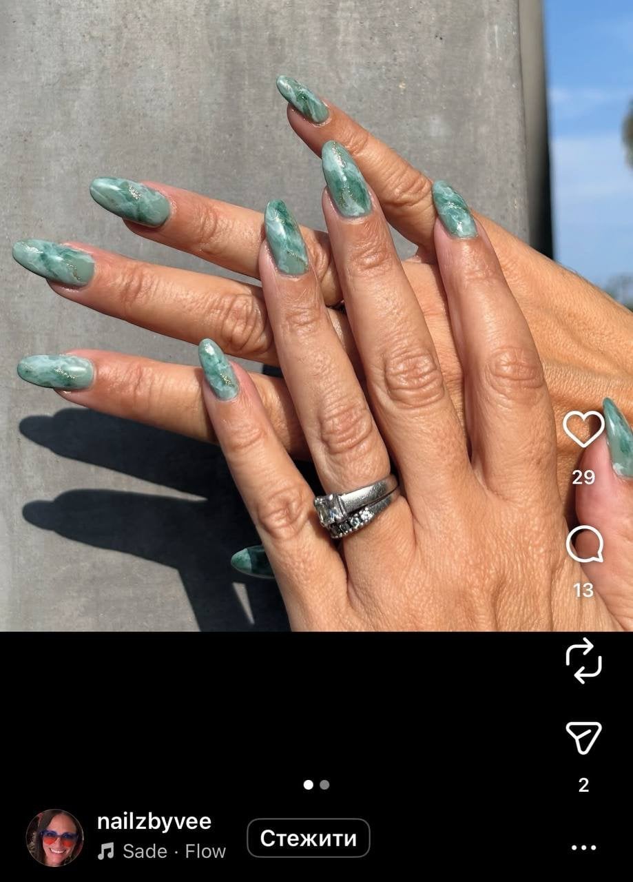 Цей манікюр повторює характерну текстуру нефриту: мармурові зелені переливи з молочним підтоном, які мають водночас стильний і природний вигляд. Можна обрати напівпрозорий мінімалістичний варіант або ж глибокі смарагдові тони із золотими акцентами. Ідей достатньо, щоб манікюр виглядав і заспокійливо, і ефектно.