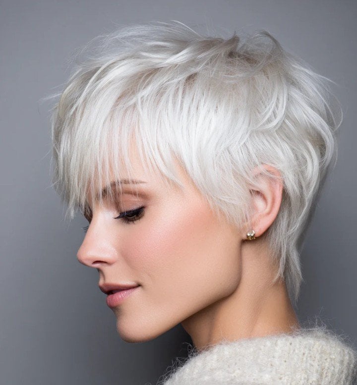 Укорочений мікро-чубчик є актуальним трендом, проте для гармонійного вигляду його краї варто робити м’якими, уникаючи надмірно різких ліній. Крижаний платиновий колір надає зачісці графічності та наповнює образ особливою свіжістю.