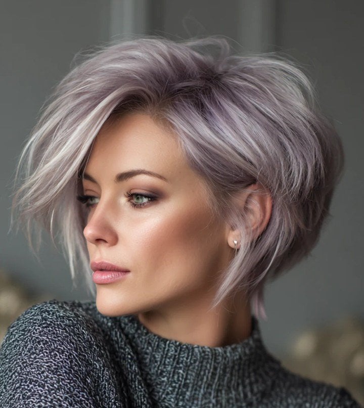 Подовжений варіант каре допомагає візуально подовжити шию та надає контурам обличчя більшої чіткості. Додавання делікатного фіолетового відтінку до природної сивини дозволяє створити креативний, але цілком доречний для щоденного життя образ.