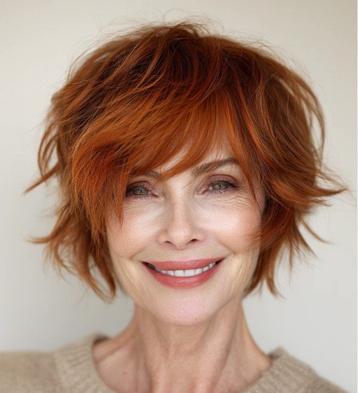 Стрижка біксі поєднує в собі найкращі риси боба та піксі — вона практична, створює чудовий об’єм і виглядає актуально. Завдяки полегшеній маківці зачіска забезпечує виражений ефект омолодження. М’який каштановий колір із рудуватим відливом додає обличчю свіжості та приємного сяйва.