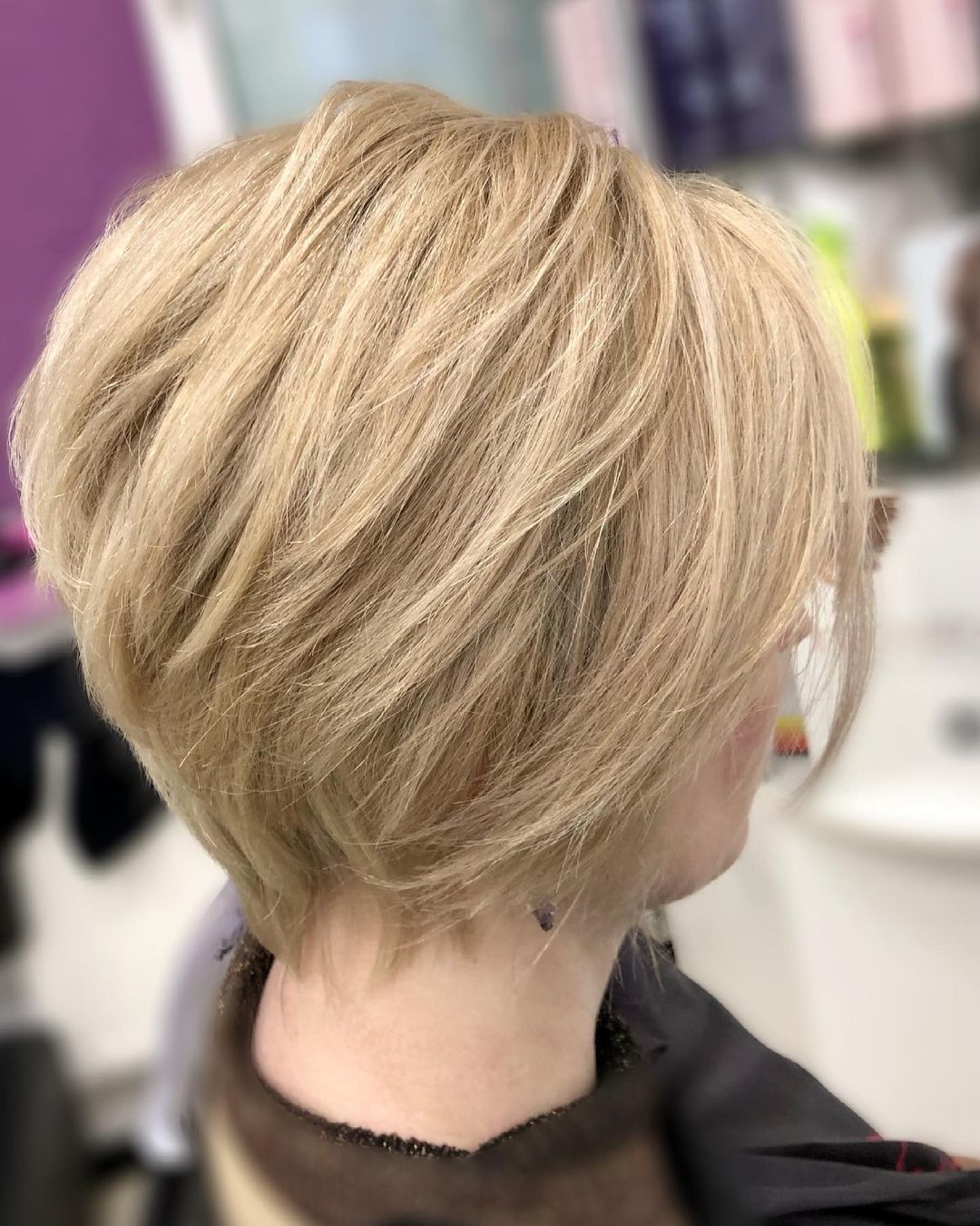 Ця зачіска очолює список омолоджувальних стрижок, що не дивно, оскільки вона надає об’єму тонкому й ослабленому волоссю, робить обличчя відкритим, а загальний образ стильним. Зачіска має короткі пасма на маківці і довгі на потилиці, підходить для пані з овальним або круглим лицем.