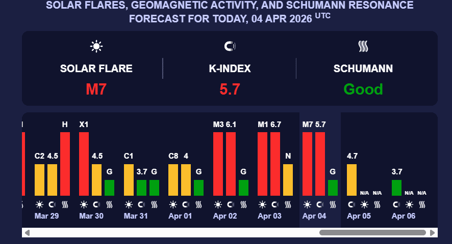 У суботу, 4 квітня, очікується потужна магнітна буря. Сонячна активність підвищилася до К-індексу 5,7 — червоний рівень збурення.