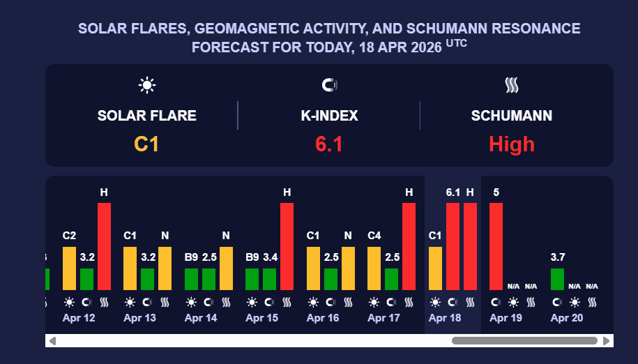 У неділю, 19 квітня, в Україні знову очікується сильна сонячна активність із К-індексом 5. Червоний рівень відповідає потужним магнітним бурям.