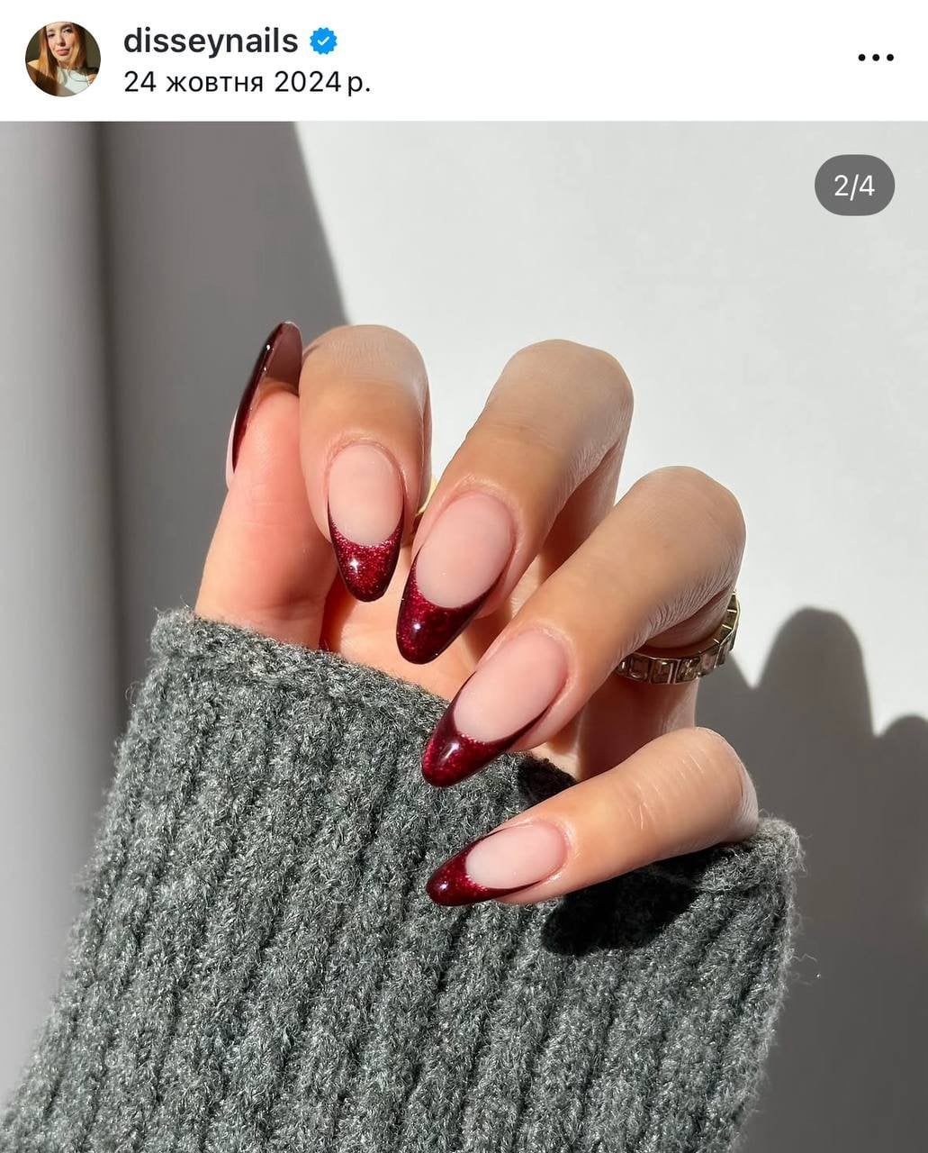 Варіантів оксамитового манікюру безліч — починаючи від комбінацій омбре з контрастними кольорами і закінчуючи магнітними французькими кінчиками у святкових кольорах. А ще — популярний горошок, який підійде для будь-якої нагоди, а також складні мінімалістичні наклейки, які додадуть свого особливого шарму.