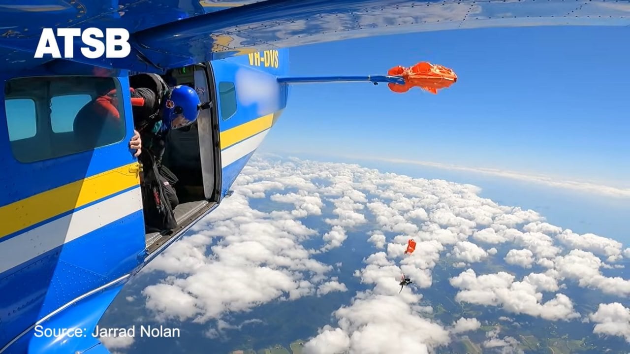 Австралійське бюро транспорту та безпеки (ATSB) опублікувало приголомшливі кадри інциденту, що стався у Далекому Північному Квінсленді. На відео помітно як парашутист боровся за життя, зависнувши під літаком після випадкового розкриття запасного парашута.
