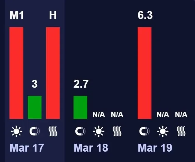 Крім того, вранці 17 березня зафіксували ще один спалах на Сонці класу M (середнього рівня). Його викид також сприятиме подальшому посиленню геомагнітної активності.
