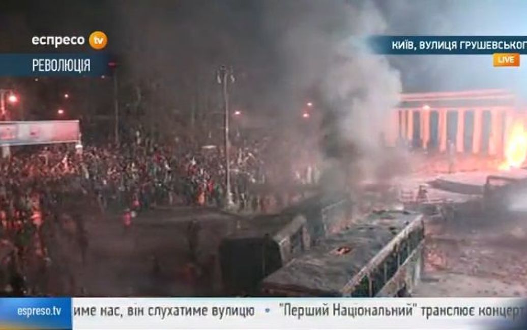 На даний момент протестувальники створюють барикади зі згорілих автобусів, шматків забору та інших матеріалів. Активний натиск демонстрантів затих, лише зрідка гримлять вибухи. Ще догорає один автобус, який правоохоронці намагаються загасити за допомогою водометів, а також яскраво спалахнула "десятка", яка горіла поруч зі входом на стадіон.