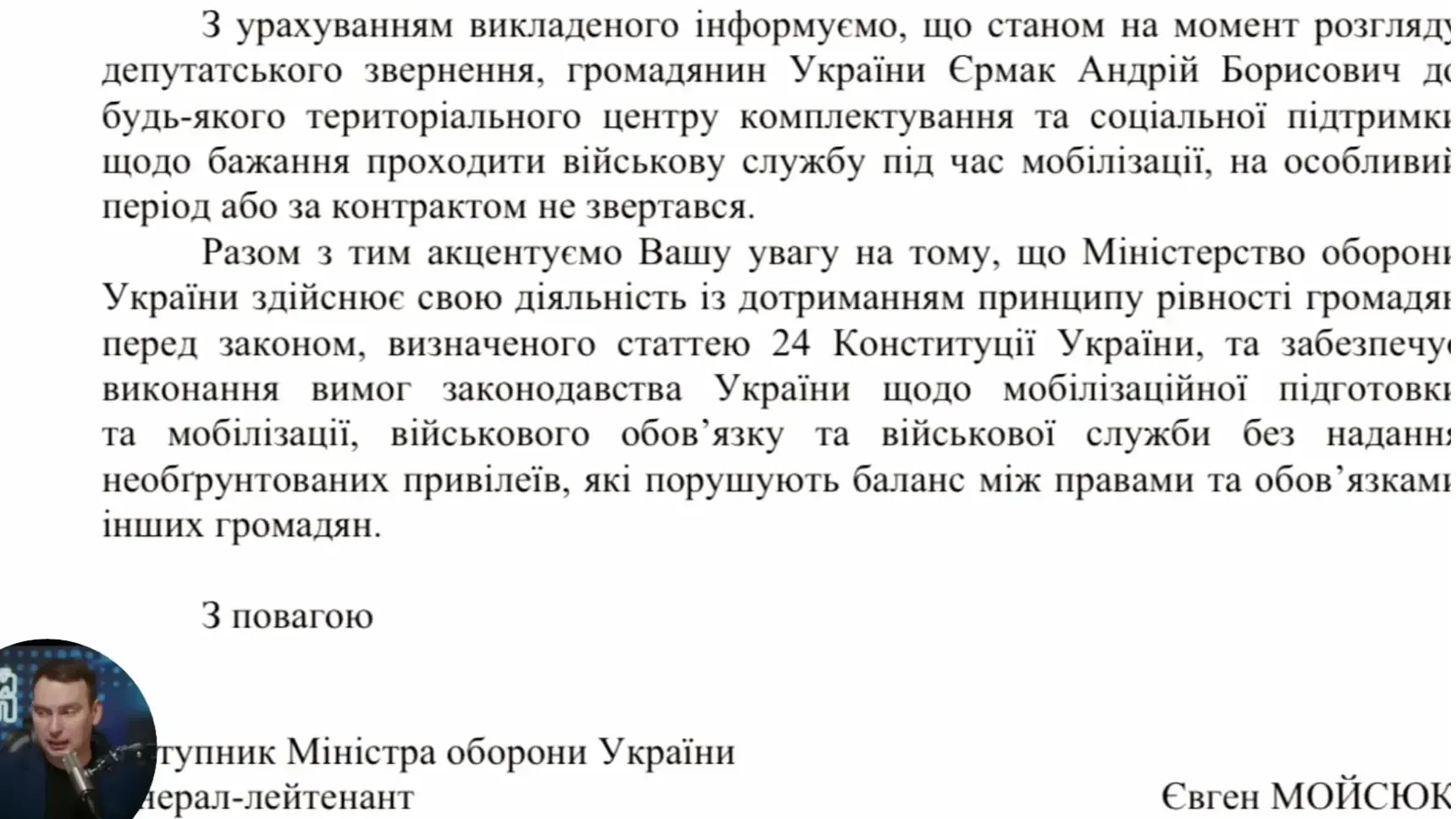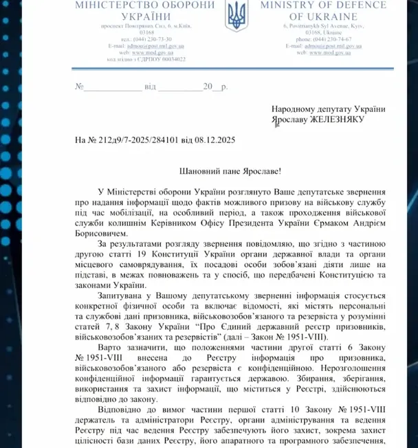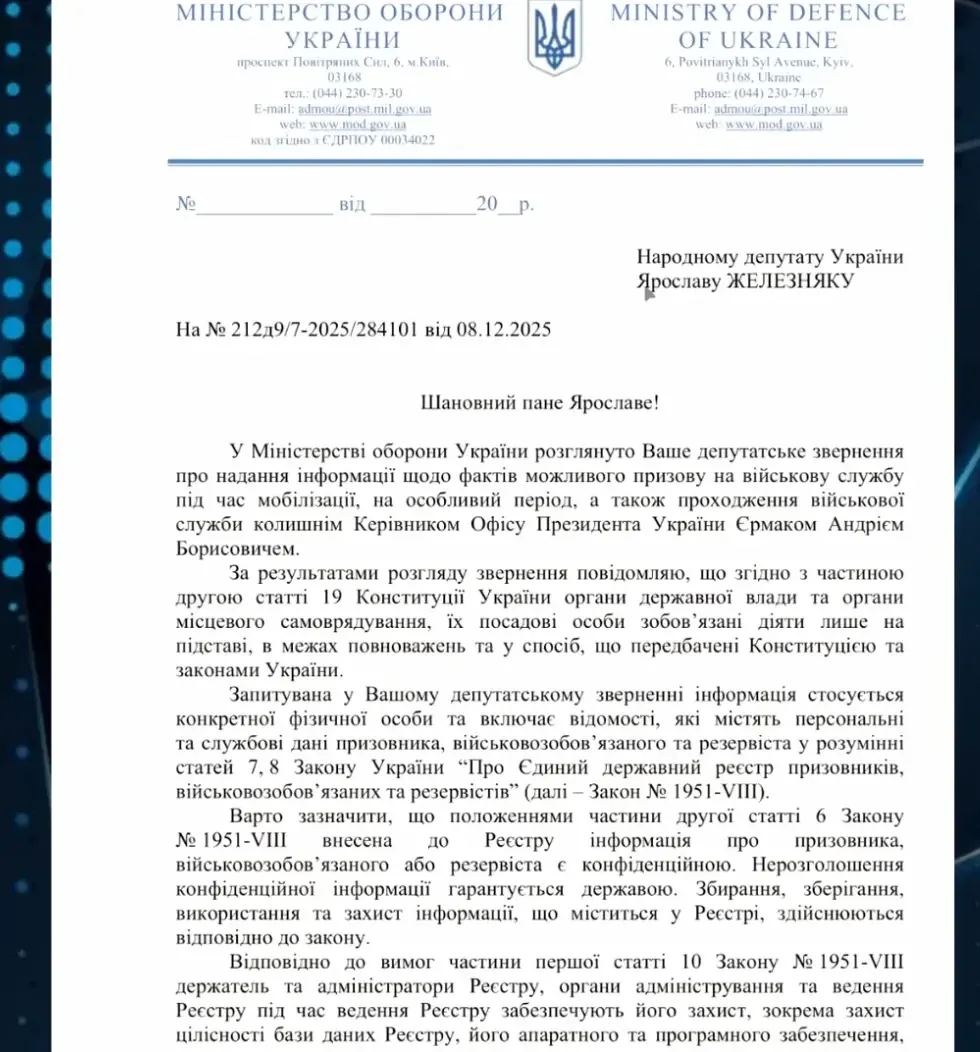 «Інформуємо, що… громадянин України Єрмак Андрій Борисович до будь-якого територіального центру комплектування та соціальної підтримки щодо бажання проходити військову службу під час мобілізації, на особливий період або за контрактом не звертався», — сказано у документі.