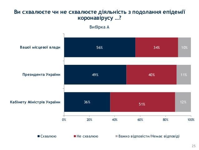 Крім того, 56% опитаних схвалюють діяльність місцевої влади з подолання пандемії коронавірусу, 49% респондентів підтримуюють роботу президента у цьому напрямку, а 36% - дії Кабміну.