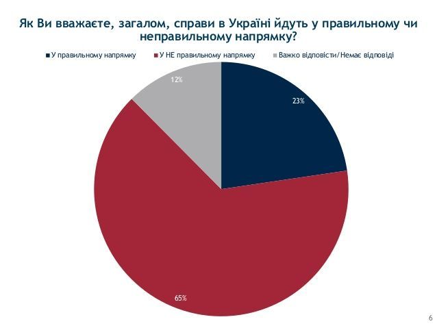 Крім того, 65% опитаних вважають, що загалом справи в Україні йдуть у правильному напрямку. 12% респондентів з ними не згодні. 23% не визначилися з відповіддю.