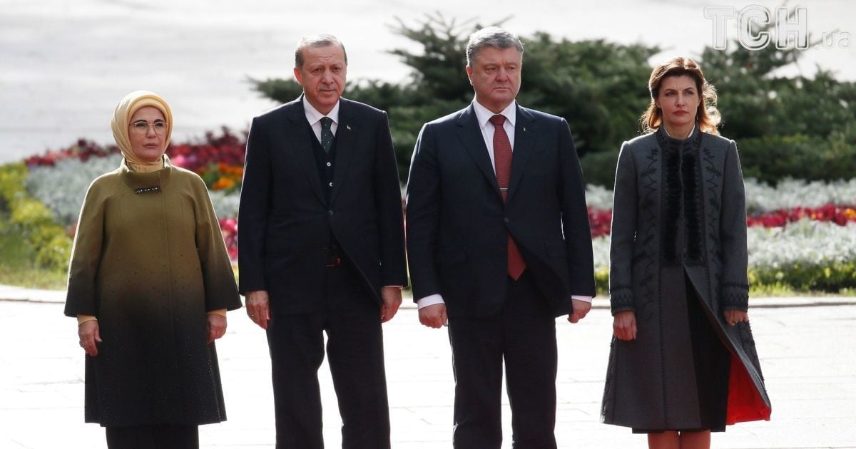 Порошенко та його дружина Марина зустрічали Ердогана та його дружину Еміне на ґанку адміністрації на червоному килимі. Оркестр почесної варти президента зіграв державні гімни України та Туреччини.
