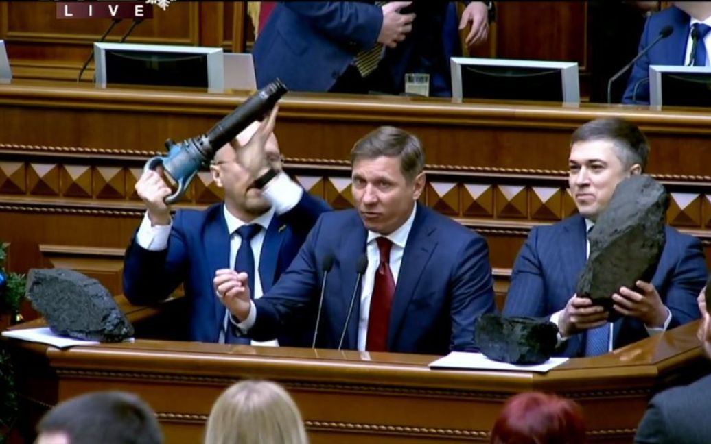 Народні депутати з груп "За майбутнє" та "Довіра", тримаючи у руках шматки вугілля та відбійний молоток, вимагали виплатити зарплату українським шахтарям, яку не видають вже півроку.