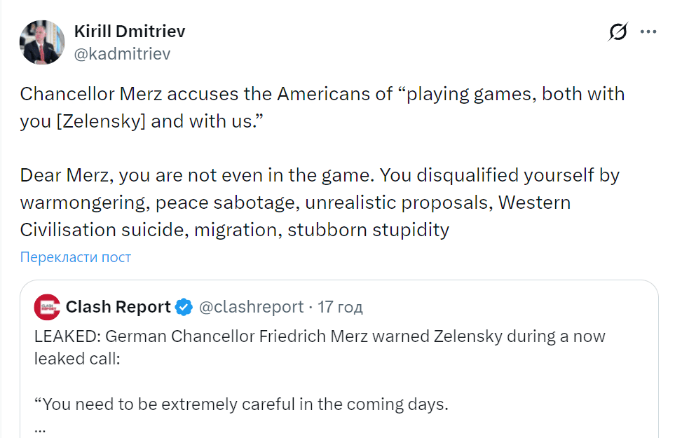 Дмитрієв зачепився за фразу, яку нібито сказав Мерц у розмові, що «вони ведуть гру — і з вами, і з нами» (Україною і Європою).