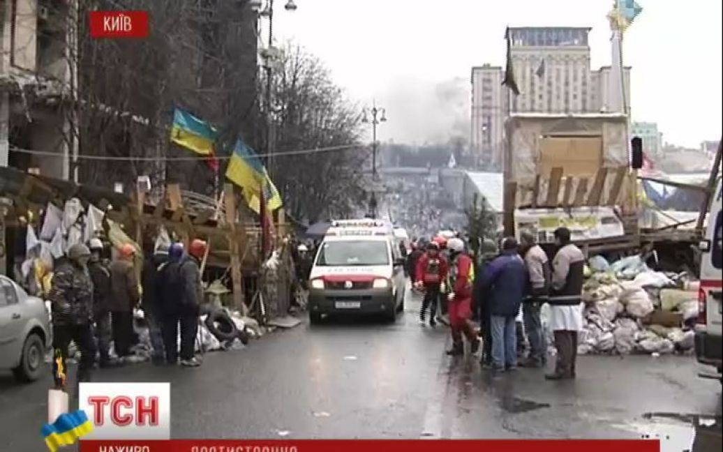 Стріляють в активістів прямо перед камерами журналістів. Двох молодих людей поранили в шию перед знімальною групою ТСН. Протестувальники негайно відтягли поранених до карети швидкої.