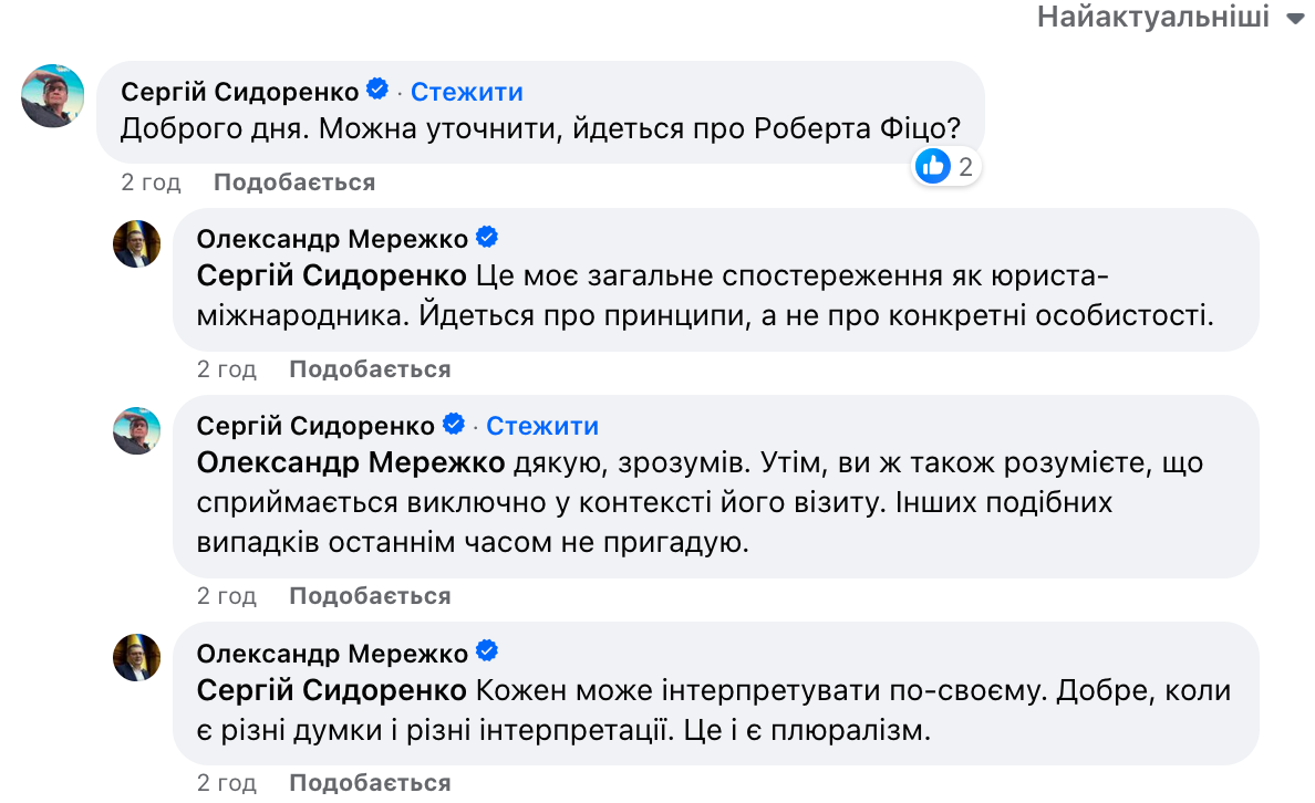 У коментарях під своїм постом на запитання читачів, чи Мережко має на увазі Роберта Фіцо, він відмовився підтверджувати або спростовувати це і наголосив, що це його "загальне спостереження як юриста-міжнародника".