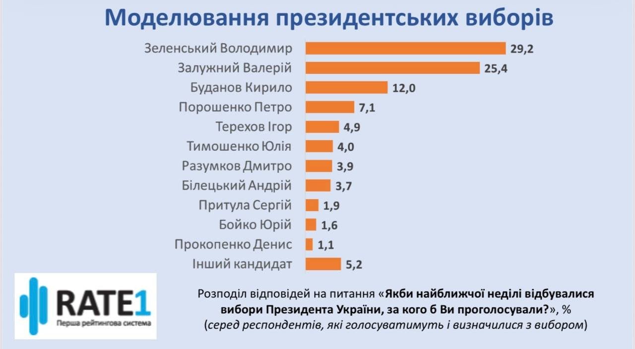 Лідером рейтингу на можливих президентських виборах є В.Зеленський. Його готові підтримати 29,2% серед тих, хто визначився та піде голосувати. До чільної п’ятірки також входять В.Залужний (25,4%), К.Буданов (12,0%), П.Порошенко (7,1%) та І.Терехов (4,9%).
