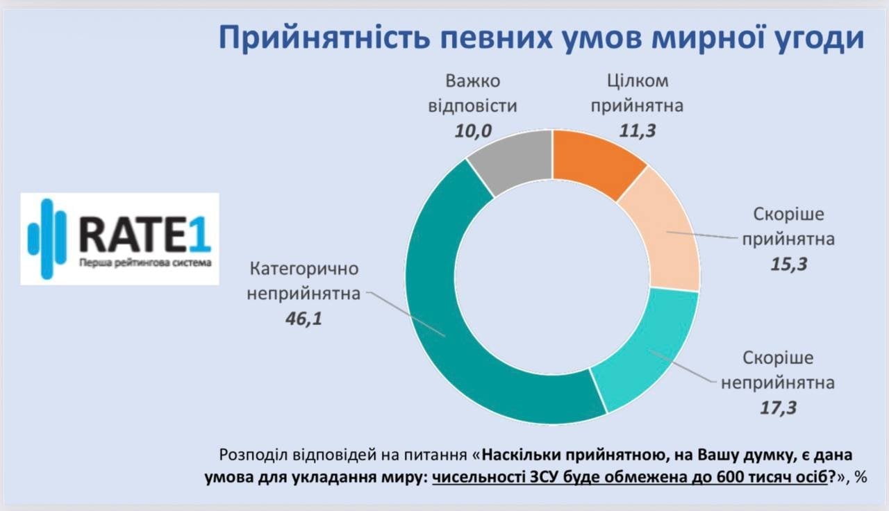 Також неприйнятною для українських громадян є вимога щодо зменшення чисельної української армії. Категорично не прийнятною або скоріше не прийнятною назвали таку умову майже 2/3 (63,4%) респондентів.