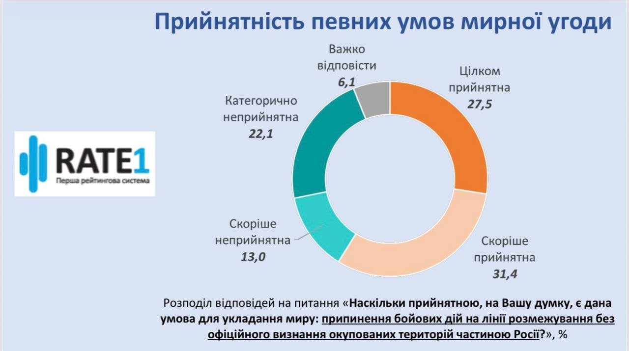 Щодо умов мирної угоди, то абсолютна більшість – 86,1% опитаних вважають неприйнятним визнання тимчасово окупованих територій Криму, Донецької, Луганської, Запорізької та Херсонської областей територією агресора. При цьому 71,8% вважають таку вимоги категорично неприйнятною.