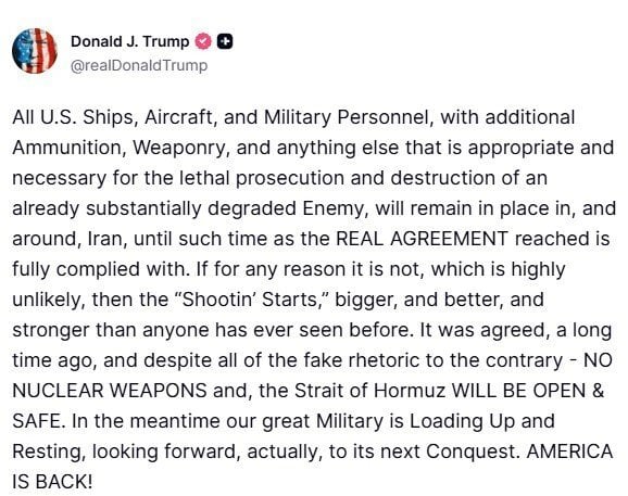 «Усі кораблі, літаки та військовий персонал США, з додатковими боєприпасами і озброєнням, що є доречним та необхідним для смертельного переслідування та знищення вже суттєво ослабленого ворога, залишатимуться на місцях в Ірані та навколо нього доти, доки не буде повністю виконано справжню угоду, досягнуту в Ірані», — заявив американський лідер.