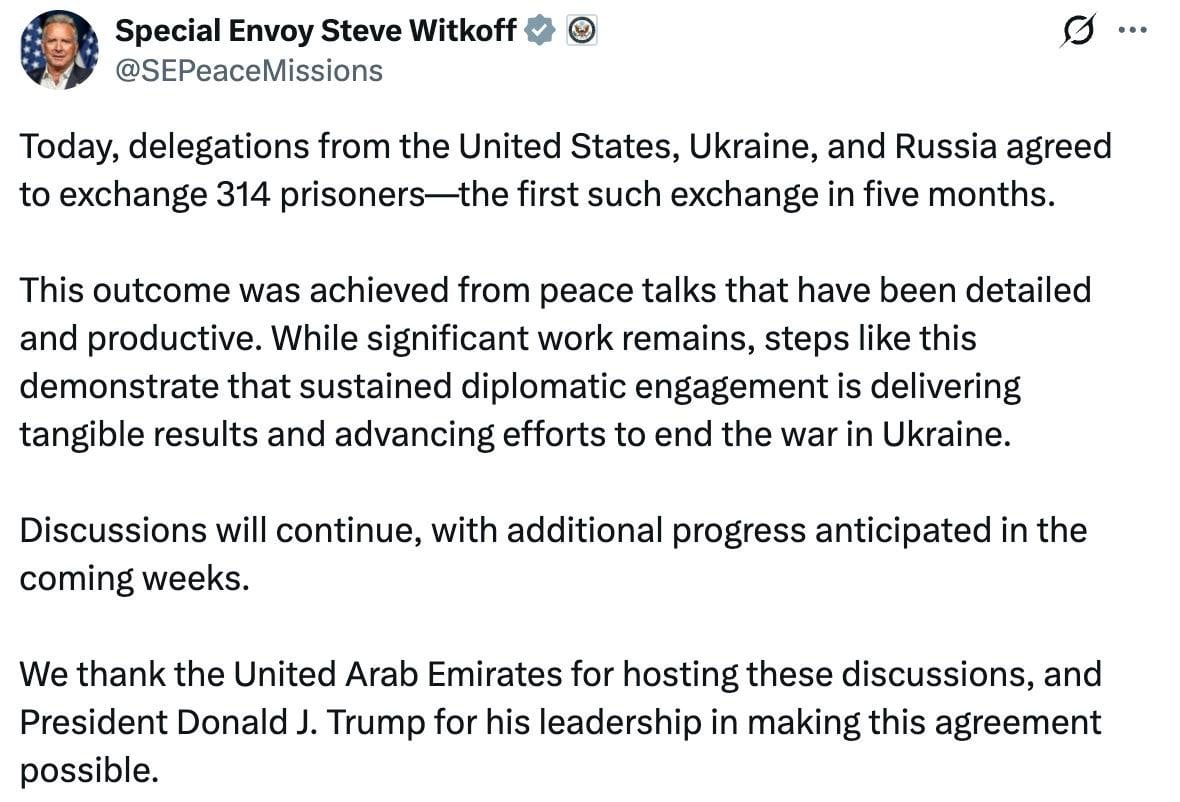 Також повідомляється, що під час переговорів в Абу-Дабі представники Російської Федерації, Україна та Сполучених Штатів Америки домовилися про обмін 314 полоненими.