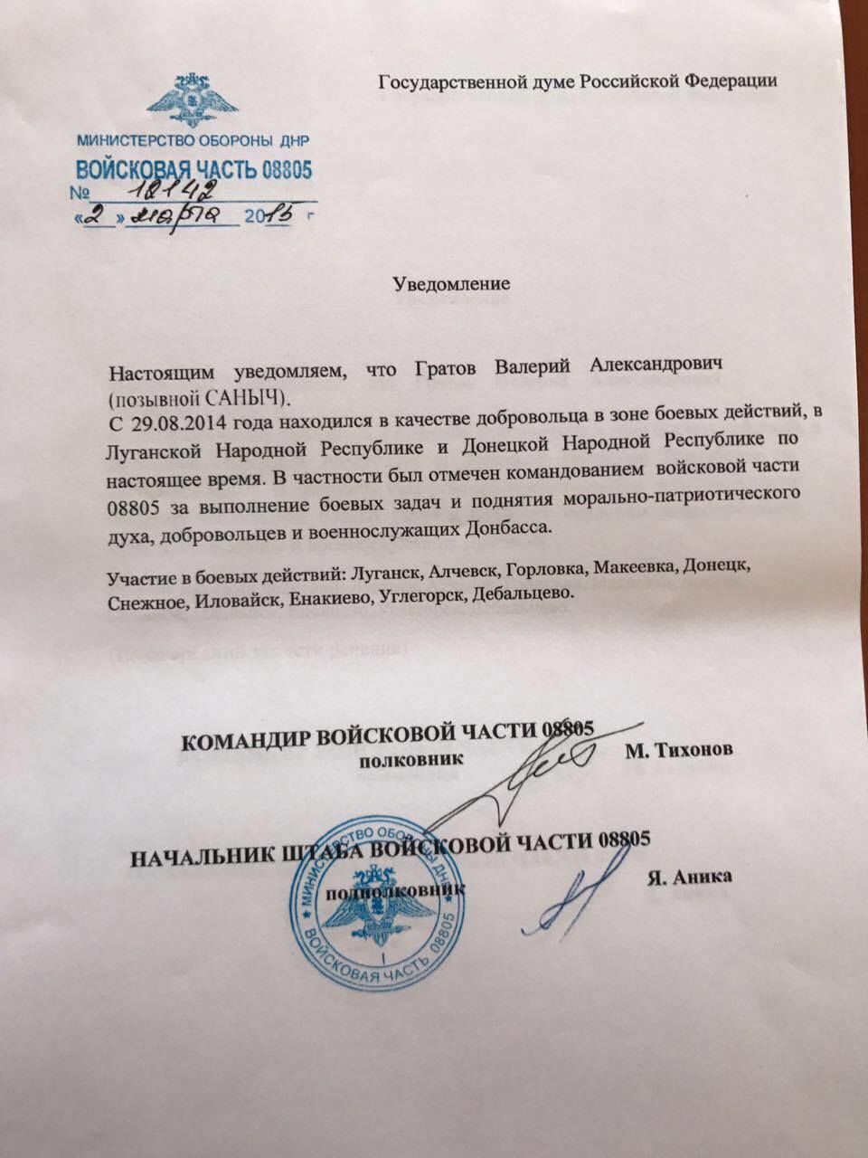 Крім того, серед документів було виявлено лист командира одного з незаконних збройних формувань, адресований Держдумі Російської Федерації, а якому йдеться про те, що Гратов брав участь у бойових діях у Луганську, Алчевську, Макієвці, Донецьку, Сніжному, Іловайську, Єнакієвому, Вуглегірську і Дебальцевому, під час яких навіть отримав поранення середньої важкості.