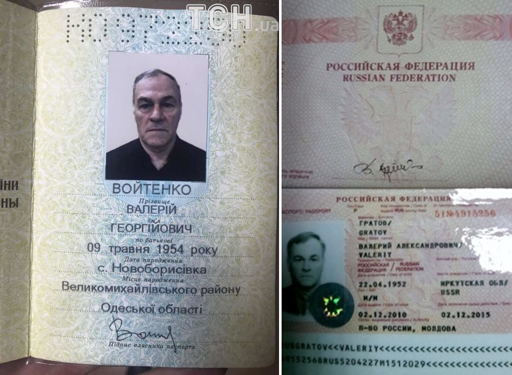 Фальшивий паспорт на ім'я Валерія Войтенка, з яким Гратов перетинав кордон, і справжній паспорт громадянина РФ, який під час обшуку знайшли серед речей Валерія Гратова / © ТСН.ua